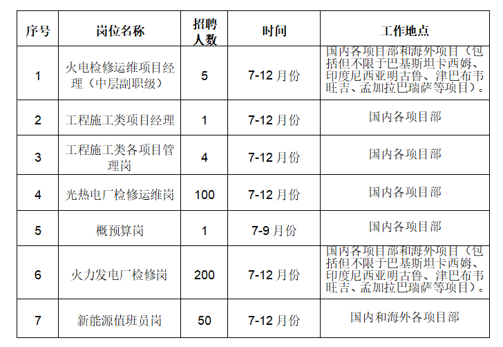 中電建電力運(yùn)維管理有限公司(以下簡(jiǎn)稱公司)是中電建電力投資集團(tuán)有限公司的全資子公司,根據(jù)業(yè)務(wù)發(fā)展需要,現(xiàn)面向電建電投公司內(nèi)部和社會(huì)公開招聘火電檢修項(xiàng)目經(jīng)理(中層副職級(jí))、工程施工類項(xiàng)目經(jīng)理等管理人員。 一、招聘單位簡(jiǎn)介 公司擁有電力工程、建筑工程等多項(xiàng)施工總承包資質(zhì)、鍋爐安裝特種設(shè)備許可證A級(jí)、工業(yè)管道安裝(GC2),電力設(shè)施承裝(修、試)等資質(zhì),通過了“三標(biāo)一體”認(rèn)證、安全標(biāo)準(zhǔn)化一級(jí)企業(yè)評(píng)審和應(yīng)急能力建設(shè)評(píng)審,2023年被甘肅省科技廳認(rèn)定為科技型企業(yè)。是中國(guó)電建集團(tuán)國(guó)內(nèi)外火電資產(chǎn)的技術(shù)支持中心、人才培訓(xùn)中心和生產(chǎn)保障中心。 目前主營(yíng)業(yè)務(wù)范圍為:火電和新能源電站的檢修、運(yùn)維、技改、安裝、施工、電氣試驗(yàn);及水利水電、建筑、電力等工程總包施工。 二、崗位需求人數(shù)及工作地點(diǎn) ?三、招聘要求 (一)基本條件 1.政治立場(chǎng)堅(jiān)定,堅(jiān)決貫徹執(zhí)行黨和國(guó)家的方針政策。 2.遵紀(jì)守法,品行端正;具有較強(qiáng)的責(zé)任心、事業(yè)心和良好的大局意識(shí)及團(tuán)隊(duì)協(xié)作精神;無不良記錄。 3.具備較高的專業(yè)技術(shù)或業(yè)務(wù)水平、較強(qiáng)的書面表達(dá)和良好的溝通協(xié)調(diào)能力。 4.身體健康,無行業(yè)禁忌疾病。 5.工作地點(diǎn)服從公司安排。 (二)崗位任職資格 1.火電檢修運(yùn)維項(xiàng)目經(jīng)理(中層副職級(jí)) 全日制大學(xué)??萍耙陨蠈W(xué)歷且后續(xù)學(xué)歷達(dá)到本科及以上,電氣自動(dòng)化、熱能動(dòng)力工程等相關(guān)專業(yè);持有中級(jí)及以上職稱;具有3年以上330MW機(jī)組以上火電檢修班長(zhǎng)、專工、負(fù)責(zé)人工作經(jīng)歷或3年以上330MW機(jī)組以上火電機(jī)組維保項(xiàng)目副經(jīng)理及以上工作經(jīng)歷;年齡一般不超過42周歲,特別優(yōu)秀的人才可以適當(dāng)放寬至45歲。 2.項(xiàng)目經(jīng)理(建筑、電力、水利水電、新能源等施工工程) 全日制本科及以上學(xué)歷,土木工程、水利水電等工程管理相關(guān)專業(yè);中級(jí)及以上職稱,具有注冊(cè)建造師執(zhí)業(yè)資格證書;具有土建、電力、水利水電、新能源等施工項(xiàng)目管理經(jīng)驗(yàn);年齡一般不超過40周歲,特別優(yōu)秀的人才可以適當(dāng)放寬條件。 3.工程項(xiàng)目管理(技術(shù)、施工、質(zhì)量、安全、測(cè)量等相關(guān)崗位) 全日制??萍耙陨蠈W(xué)歷,土木工程、水利水電等工程管理類相關(guān)專業(yè);初級(jí)及以上職稱;具有在項(xiàng)目從事施工、質(zhì)量、安全、測(cè)量等崗位工作經(jīng)驗(yàn);具有注冊(cè)建造師執(zhí)業(yè)資格證書者優(yōu)先;年齡一般不超過35周歲,特別優(yōu)秀的人才可以適當(dāng)放寬條件。 4.光熱電廠檢修運(yùn)維崗 全日制大專及以上學(xué)歷,電氣自動(dòng)化、熱能動(dòng)力工程等相關(guān)專業(yè);從事光熱電廠檢修運(yùn)維3年以上工作經(jīng)驗(yàn);年齡一般不超過40周歲,特別優(yōu)秀的人才可以適當(dāng)放寬條件。 5.概預(yù)算 全日制本科及以上學(xué)歷,工程造價(jià)、概預(yù)算、水利水電、建筑工程等相關(guān)專業(yè);具有中級(jí)及以上職稱;具有水利水電、建筑、新能源等工程項(xiàng)目概預(yù)算工作經(jīng)驗(yàn),熟悉概預(yù)算軟件;能夠適應(yīng)出差或駐項(xiàng)目現(xiàn)場(chǎng);具有造價(jià)工程師執(zhí)業(yè)資格證書優(yōu)先;年齡一般不超過35周歲,特別優(yōu)秀的人才可以適當(dāng)放寬條件。 6.火力發(fā)電廠檢修人員(熱控、脫硫、輸煤、除灰等專業(yè)) 全日制大專及以上學(xué)歷,電氣自動(dòng)化、發(fā)電廠熱能動(dòng)力等相關(guān)專業(yè);從事火力發(fā)電廠熱控、脫硫、輸煤、除灰專業(yè)等5年以上工作經(jīng)驗(yàn);年齡一般不超過40周歲,特別優(yōu)秀的人才可以適當(dāng)放寬條件。 7.新能源值班員(光伏、風(fēng)電) 全日制大專及以上學(xué)歷,光伏、風(fēng)力發(fā)電等相關(guān)專業(yè);有光伏、風(fēng)力發(fā)電工作經(jīng)驗(yàn)者優(yōu)先;年齡一般不超過30周歲,特別優(yōu)秀的人才可以適當(dāng)放寬條件。 四、薪酬待遇:面議 五、招聘程序及工作安排 本著公開、平等、競(jìng)爭(zhēng)、擇優(yōu)原則,招聘按照簡(jiǎn)歷投遞、資格審查、考核、考察(背景調(diào)查)、聘用等程序進(jìn)行。凡符合條件人員均可通過電子郵件(文件名以“姓名+應(yīng)聘崗位+手機(jī)號(hào)”命名)形式報(bào)名,個(gè)人簡(jiǎn)歷及相關(guān)證明材料的掃描件(包括但不限于學(xué)歷學(xué)位、職(執(zhí))業(yè)資格、職稱、任職證明等)發(fā)送至郵箱dlywrz@126.com;考核面試時(shí)間、地點(diǎn)根據(jù)簡(jiǎn)歷篩選情況以電話形式通知。 報(bào)名截止時(shí)間:根據(jù)招聘崗位報(bào)名截止時(shí)間分批次開展招聘,最遲報(bào)名時(shí)間截止9月15日。 六、咨詢電話 王先生,聯(lián)系電話:0933-7786029,18793339836。 ? | |||